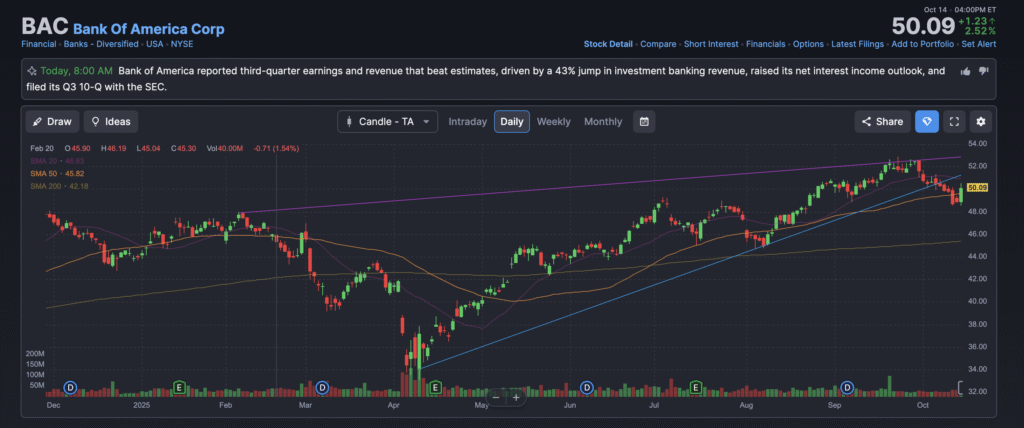 In its third quarter of 2025, Bank of America reported net income of $8.47 billion, or $1.06 per share, marking a ~23% year-over-year increase. Revenue rose ~11% to $28.09 billion, beating analyst expectations of $27.52 billion. The bank achieved a record net interest income (NII) of $15.2 billion, reflecting strength in its interest rate spread and balance sheet growth. It also saw a 43% jump in investment banking fees ($2 billion), driven by resurgence in M&A and underwriting activity. Based on that performance, the bank raised its guidance for Q4 NII to $15.6–15.7 billion.