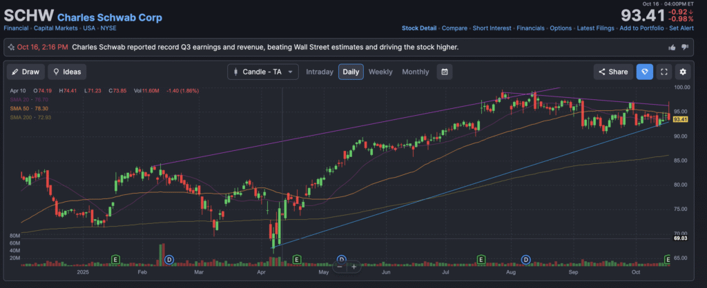 In the third quarter of 2025, Charles Schwab reported record profits. Its adjusted EPS came in at $1.31, beating consensus estimates ( ~$1.25 ) with solid margins. Net revenue for the quarter rose ~27% year-over-year to $6.14 billion, driven by strength in trading revenues and growth in client assets. Schwab also added $137.5 billion in net new core assets, and total client assets rose to $11.59 trillion. For the forward outlook, management signaled confidence in continued growth across trading, net interest margins, and advisory/asset management lines, while maintaining a strong capital return posture (e.g. buybacks) underpinned by solid balance sheet flexibility.