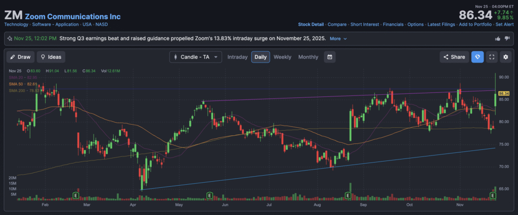 • AI Companion, Zoom Phone, and Contact Center drive steady ARPU expansion and push revenue growth back toward high-single-digits while margins remain 30–40%+ on a non-GAAP basis, turning Zoom into a cash compounder.