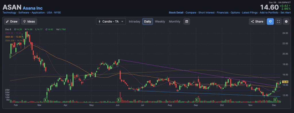 Asana reported earnings on December 4, 2024, posting EPS of –$0.04, beating analyst expectations of roughly –$0.11, while revenue came in at $188.5 million, up 13% year over year and slightly ahead of consensus. Large-customer momentum continued, particularly among clients spending over $100K ARR, which grew over 20%. Guidance for the next quarter pointed to revenue of approximately $191–193 million, implying low-teens growth, with near-breakeven non-GAAP operating margins. Full-year guidance remained conservative given enterprise optimization trends. Analysts viewed the print as stable but not breakout, noting improved profitability paired with moderate top-line expansion.