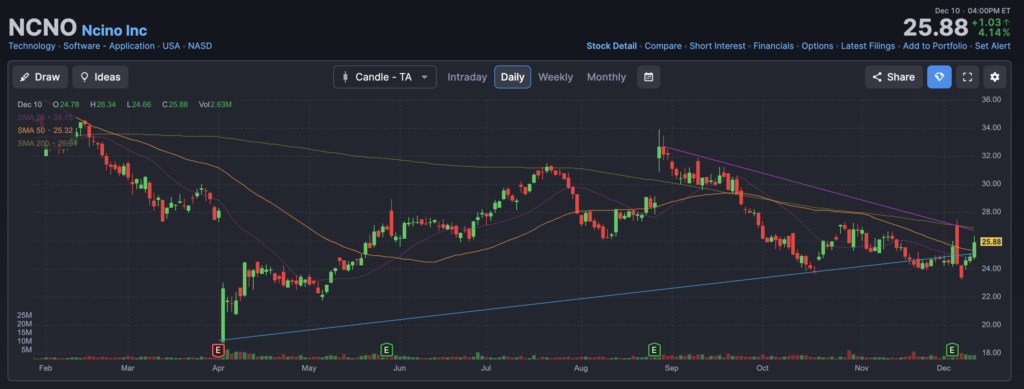 nCino is a vertical SaaS company that provides a cloud-based banking operating system used by banks, credit unions, and other financial institutions to digitize onboarding, lending, and account-opening workflows. The platform is built natively on Salesforce, which lets customers use nCino as a process and data layer on top of their existing CRM and front office. The company generates the vast majority of its revenue from recurring subscriptions, with a smaller contribution from professional services and implementation work. For the fiscal year ended January 31, 2025, nCino generated about $541 million in revenue, growing roughly 13% year over year, and now has more than $580 million of revenue on a trailing-twelve-month basis. The company is headquartered in Wilmington, North Carolina, and competes with Q2 Holdings, Temenos, Alkami, and larger banking software vendors like FIS and Fiserv.