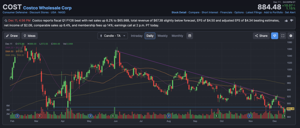 Costco reported its most recent quarterly results in December 2024 for fiscal Q1 2025, delivering EPS of approximately $4.04 on revenue near $58 billion. Revenue grew about 5% year over year, broadly in line with analyst expectations, while EPS slightly exceeded consensus due to disciplined cost control and steady membership income. Comparable sales growth was modest but positive, with traffic up and average ticket pressured by deflation in key categories. Management guided for continued low-to-mid single-digit revenue growth for the remainder of fiscal 2025, emphasizing margin stability rather than acceleration. Translation: boring, predictable, and Wall Street loves that.
