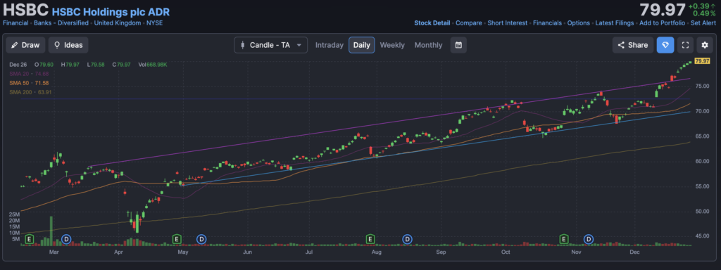 HSBC last reported earnings in Q3 2024, delivering earnings per share of approximately $0.83, modestly ahead of analyst expectations. Revenue came in near $16.2 billion, reflecting low-single-digit year-over-year growth, primarily driven by net interest income rather than volume expansion. Credit quality remained stable, with impairment charges still well below long-term averages despite macro uncertainty. Management reiterated disciplined cost control and capital returns as priorities, signaling a cautious but confident outlook.