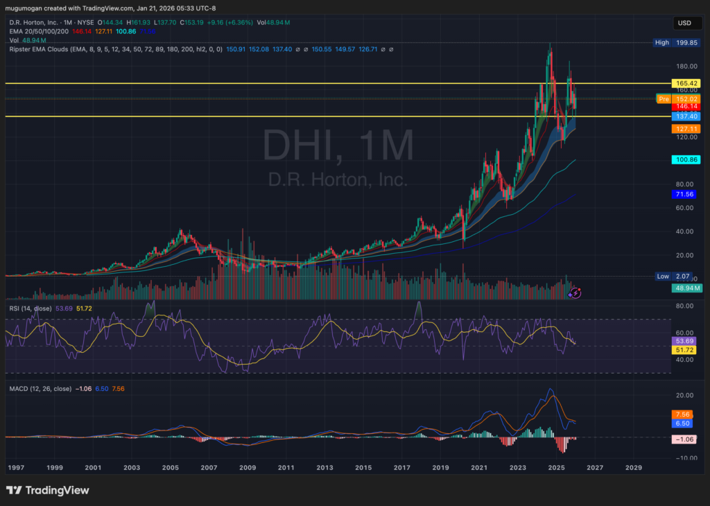 D.R. Horton is the largest homebuilder in the United States by volume, focused primarily on affordable single-family homes across entry-level, move-up, and active-adult segments. Founded in 1978, the company operates in more than 100 markets across 33 states and targets first-time and price-sensitive buyers, making it highly exposed to mortgage-rate cycles. In fiscal 2025, D.R. Horton generated approximately $36–37 billion in revenue, though growth has moderated amid affordability pressures. The company’s scale, land discipline, and standardized construction model allow it to remain profitable even in down housing cycles. Key competitors include $LEN Lennar, PulteGroup, and NVR.