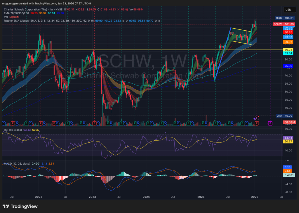 Charles Schwab reported earnings this week for Q4 FY2025, delivering results that beat expectations on profitability but showed slower revenue momentum. The company reported EPS of approximately $0.70, ahead of analyst expectations of around $0.66. Revenue came in near $4.6 billion, modestly above consensus but down slightly year-over-year due to pressure on net interest income. Net interest revenue declined year-over-year as rate cuts and higher funding costs compressed spreads, though management noted stabilization sequentially. Schwab guided to modest revenue growth in 2026, driven by asset inflows, fee growth, and expense discipline, while net interest income is expected to recover gradually as balance-sheet repricing progresses.