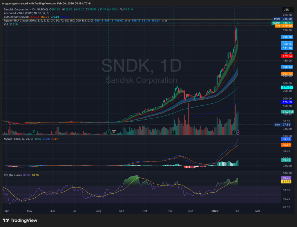 SanDisk reported fiscal second-quarter 2026 earnings last week, delivering one of the strongest quarters in the memory sector this cycle. The company posted adjusted earnings per share of approximately $6.20, far ahead of consensus expectations that had been closer to the mid-$3 range, representing year-over-year growth of well over 300 percent. Quarterly revenue reached roughly $3.0 billion, up about 60 percent year over year and comfortably ahead of analyst estimates, driven by pricing recovery and stronger bit shipments. Management cited tight industry supply, disciplined capex, and accelerating AI-related demand as the core drivers of the upside. Gross margins expanded into the low-50 percent range, reflecting favorable pricing and mix. For the upcoming quarter, SanDisk guided revenue to approximately $4.4–$4.8 billion and EPS in the $12–$14 range, implying another sharp sequential step-up and well above prior Street models.