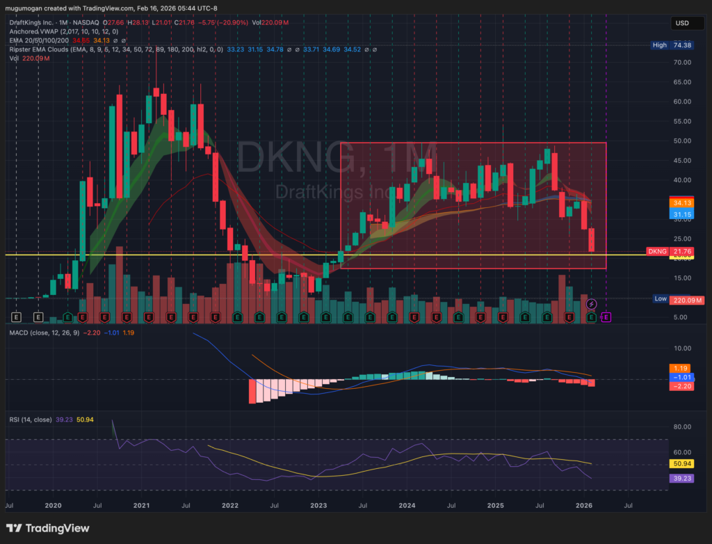 DraftKings reported earnings last week for Q4 2025, posting revenue of approximately $1.4 billion, up roughly 25–30% year-over-year, ahead of analyst expectations. Adjusted EPS came in narrower than expected, with losses improving significantly versus last year as promotional intensity declined and structural margins expanded. The company reiterated its full-year 2026 revenue guidance in the range of $6.2–$6.4 billion and projected positive adjusted EBITDA for the full year, continuing its path toward sustained profitability. Management highlighted improved customer acquisition efficiency and stronger hold rates during the NFL season. The stock reacted positively in after-hours trading as investors focused on EBITDA inflection rather than GAAP losses.