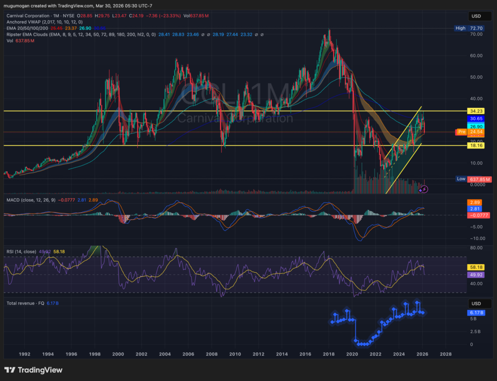 Carnival Corporation & plc is the world’s largest cruise operator, controlling ~45% of global cruise capacity across brands like Carnival Cruise Line, Princess Cruises, and Holland America Line. The company operates over 90 ships serving ~700+ ports globally, targeting mass-market, premium, and luxury segments. Its business model is highly fixed-cost, meaning profitability swings dramatically with occupancy and pricing. Post-pandemic, Carnival has been in a multi-year recovery phase, focused on deleveraging and restoring margins. The stock is essentially a leveraged bet on global travel demand and consumer discretionary spending.