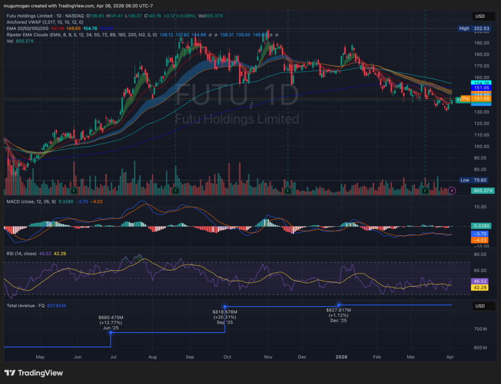 This is a classic post-parabolic pullback—weekly shows FUTU ran hard to $200 and is now correcting into the 20–50 week EMA zone ($125–$145), which is a logical institutional support area. The daily confirms short-term weakness: price is below all key EMAs, MACD is negative, and RSI (~42–46) is still not oversold—meaning downside isn’t fully exhausted yet.