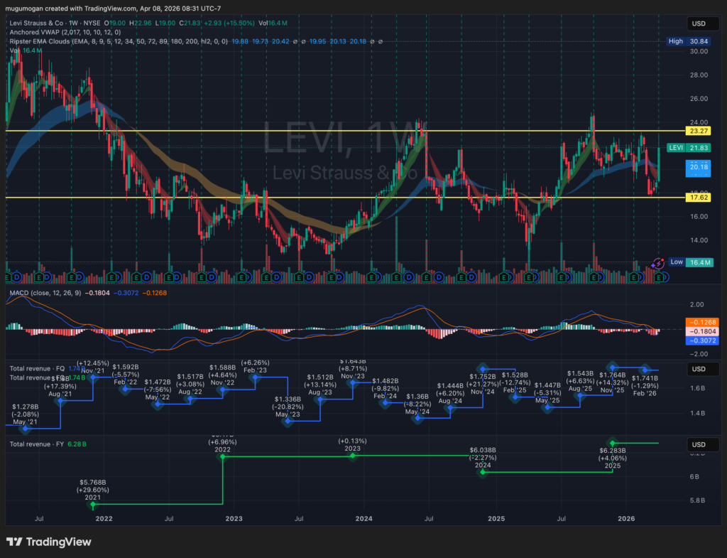 Levi (LEVI) is currently trading around $21.85, sitting between key support at ~$17.60 and resistance near ~$23.25, effectively stuck in a range-bound consolidation. The recent bounce off the lower support zone shows buyers are stepping in, but price is still below the upper resistance, so no confirmed breakout yet. The moving averages are flattening and slightly compressing, indicating indecision rather than strong trend continuation. MACD is slightly negative, suggesting momentum is still weak despite the bounce. Net: this is a base-building phase, and a clean break above ~$23.25 likely triggers upside, while losing ~$17.60 would flip the structure bearish.