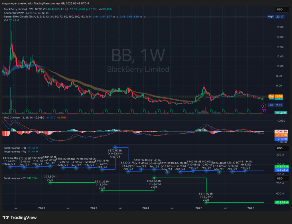 BlackBerry is a Canadian-based software and cybersecurity company that has fully transitioned away from its legacy smartphone business into enterprise security and embedded systems. The company operates primarily through two segments: Secure Communications (cybersecurity, UEM, and endpoint security) and IoT (QNX software used in automotive and embedded systems). BlackBerry’s software is embedded in over 235 million vehicles globally, giving it a strong footprint in automotive operating systems. Its strategy focuses on mission-critical security, government-grade encryption, and embedded software for regulated industries. Despite strong positioning, the company has struggled to return to consistent revenue growth, making it a turnaround story.