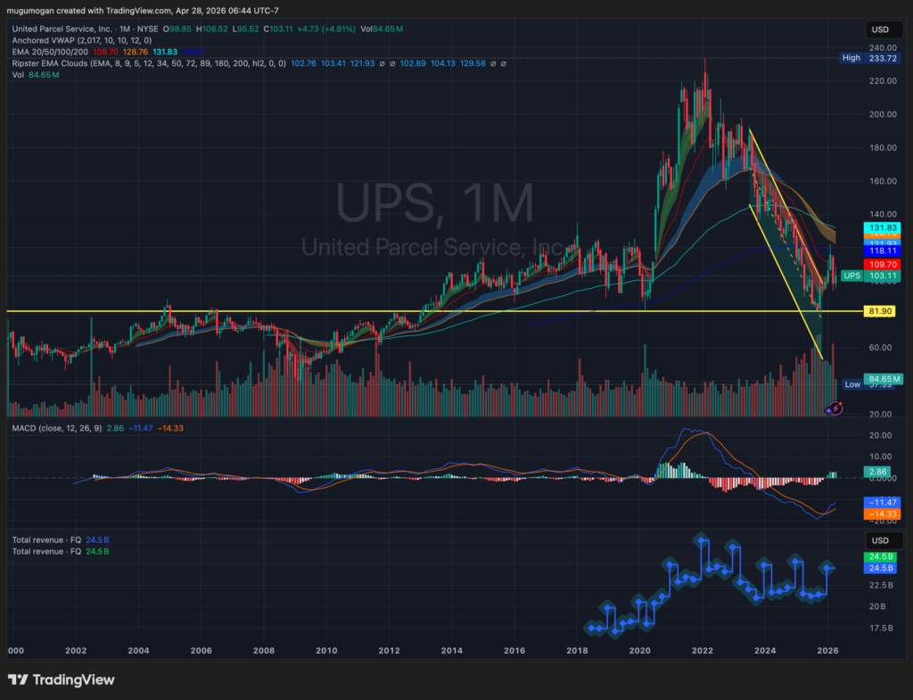 UPS (monthly) is in a clear post-peak downtrend after a blow-off move into the ~$230 range, with a series of lower highs and sustained selling pressure. Price has lost all key moving averages (20/50/200) and is now attempting a weak bounce near ~$100–$110, which is acting as near-term resistance. The long-term support zone sits around ~$80–$85 (prior base), and the recent sharp move toward it indicates forced liquidation rather than orderly rotation. Momentum (MACD) is still negative despite a slight uptick, so this looks like a reflex rally unless price can reclaim ~$130–$140 and hold above it.
